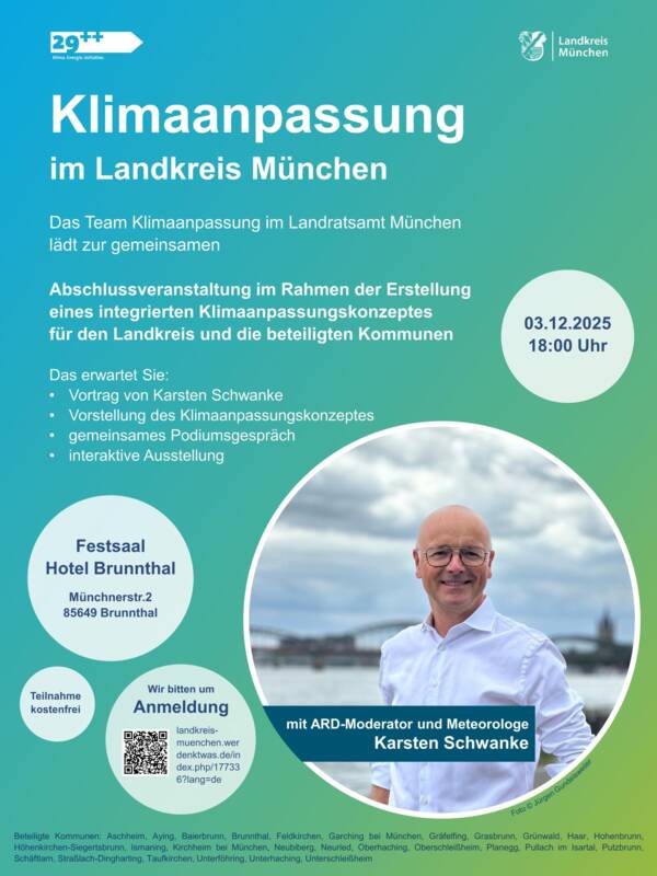 Planegg hat im Rahmen eines Förderprojekts mit dem Landkreis München in einer Zusammenarbeit mit den Kommunen Gräfelfing, Neuried, Pullach und Grünwald einen Maßnahmenkatalog zur Anpassung an die Folgen des Klimawandels erarbeitet. Die Ergebnisse werden am 03.12.2025 in einer aufregenden Abendveranstaltung in Brunnthal vorgestellt. Jeder ist herzlich willkommen!